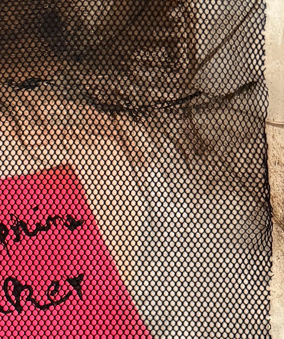 Öl, Mischtechnik + Stoff / Netz auf Leinwand